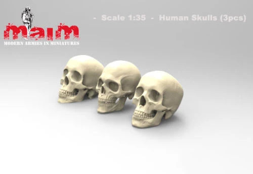 Set, das drei qualitativ hochwertige menschliche Schädel umfasst, perfekt für Fantasy-Miniaturbasen, post-apokalyptische Vignetten oder sogar Kriegsdioramen.