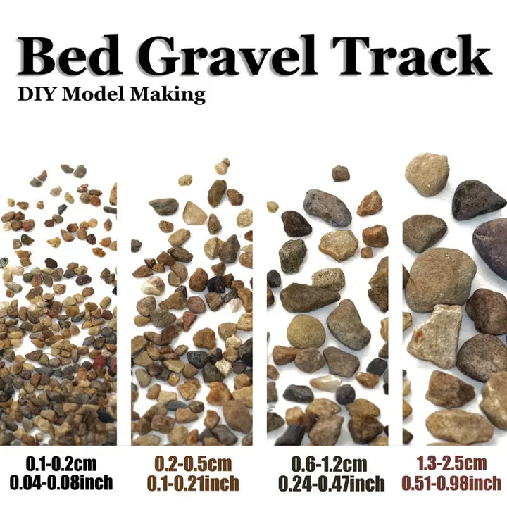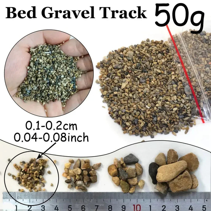50g containers of different-sized and different-colored pieces of rock to simulate ballast or gravel.