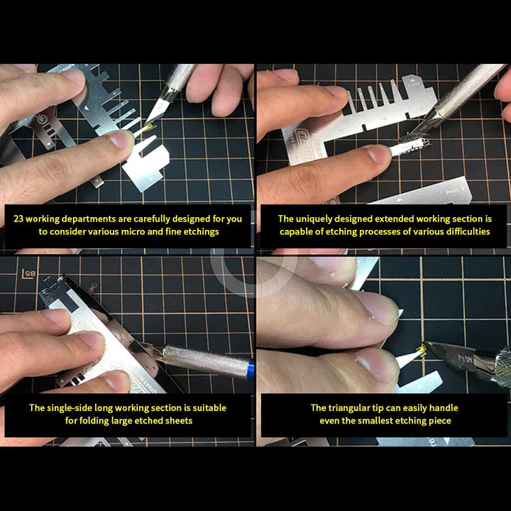 When working with photoetched (PE) parts, folding them to create a three-dimensional shape is essential. Attempting to do this by hand or with regular tweezers can lead to damage or incorrect angles.