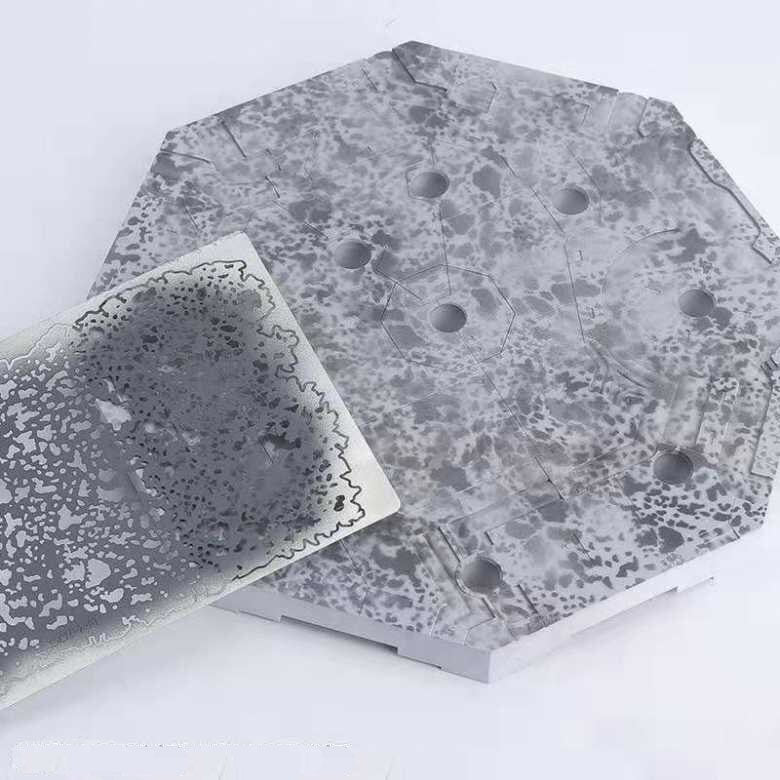 Evite superfícies grandes, monótonas e uniformes em seus modelos. Duas técnicas úteis para isso são o marmorizado e o mapeamento, pelos quais pulverizamos uma cor mais clara ou mais escura em um padrão aleatório, para depois cobri-la com a cor principal ligeiramente diluída.