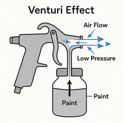 Aksi takdirde, vakum oluşumu bozulur: boya yukarı çıkmaz, venturi emişi çökebilir ve hava akışı olur ama sprey olmaz — bu, sifon sistemleriyle ilgili en yaygın başlangıç sorunudur.